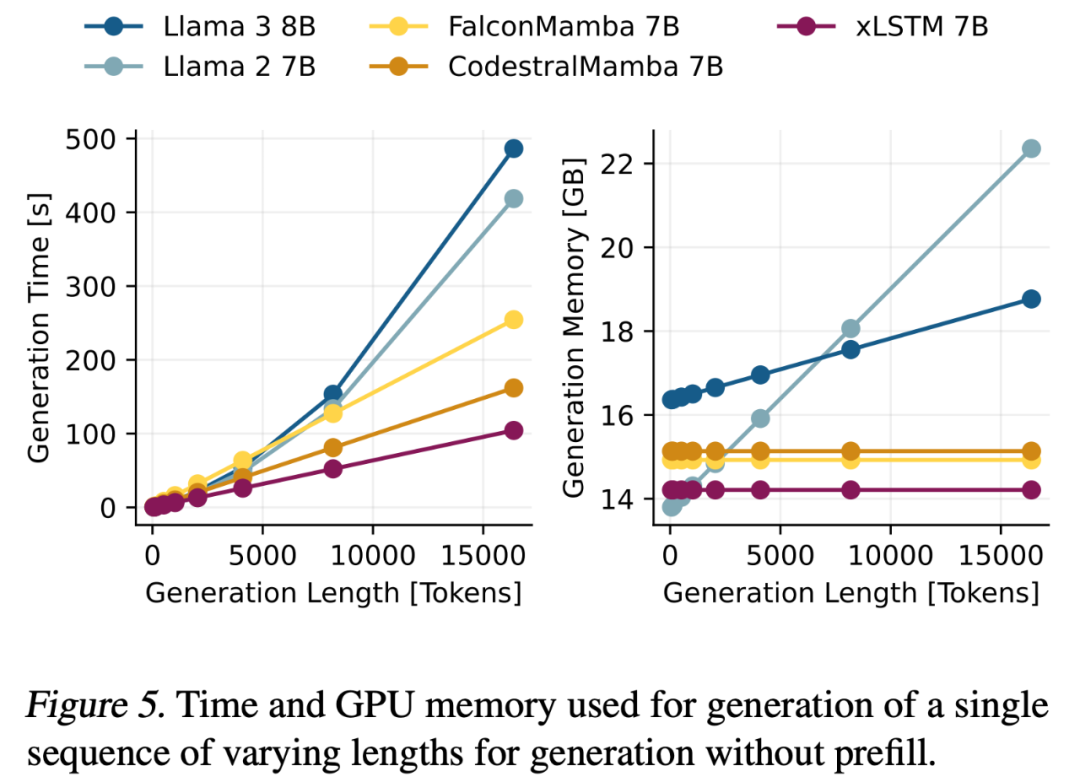 得益于优化的模块设计,mLSTM 在低维空间中运行,使得 xLSTM 7B 模型与 Mamba 模型相比具有显著更低的内存占用(如下图 5 右侧所示)和更短的生成时间(如图 5 左侧所示)。