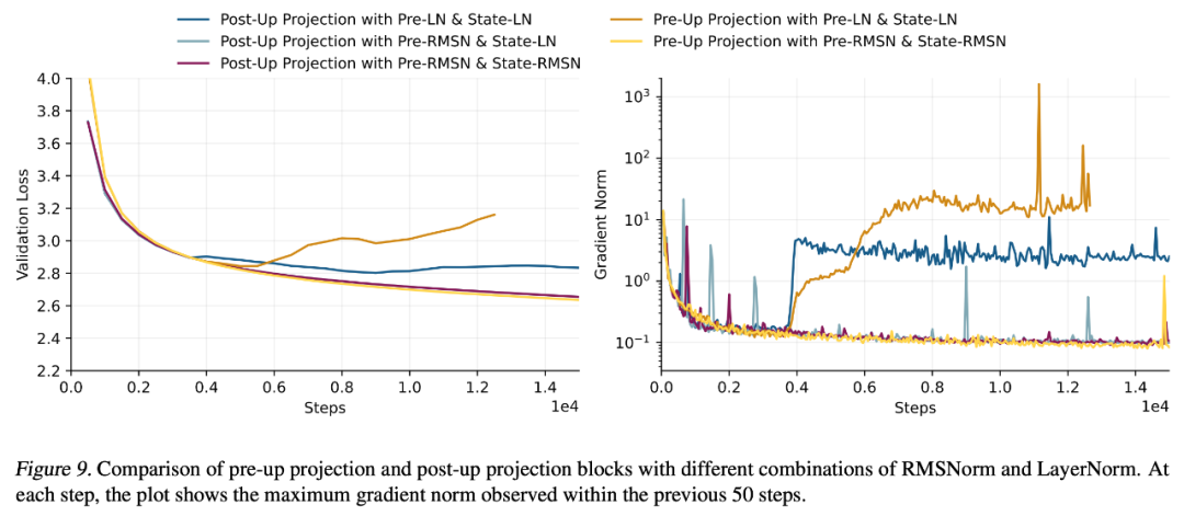 下图 9 中的实验证实,预归一化技术同样适用于 xLSTM 架构的预归一化层。因此,研究者在 xLSTM 架构中将 LayerNorm 替换为 RMSNorm(全称为 Root Mean Square Normalization)。