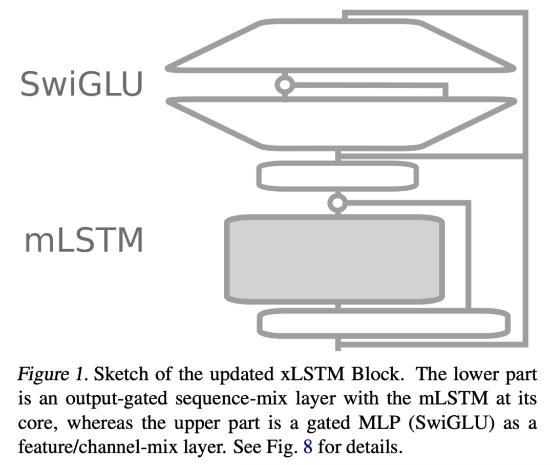 与 Mamba 等其他线性 RNN 类似,以前的 xLSTM 架构将与通道卷积相结合的 mLSTM 单元置于线性上投影和下投影之间,这被称为预上投影(pre up-projection )块。这些块将序列混合和通道混合结合在一个块中,因此均匀堆叠,而无需交错位于前馈 MLP 层。尽管预上投影块架构已展示出了对 1.4B 参数 xLSTM 的竞争性语言建模性能,但由于以下几方面的原因,它在计算效率方面付出了很大代价: