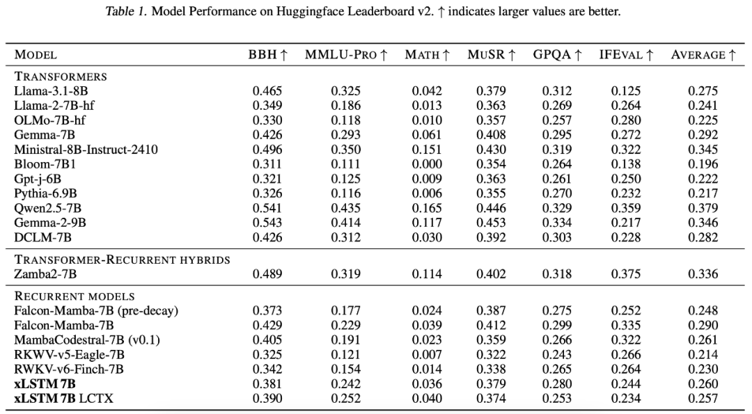 研究者首先在 7B 参数规模上,将 xLSTM 7B 与最先进的 Transformer 和循环神经网络(RNN)大语言模型进行了基准测试。