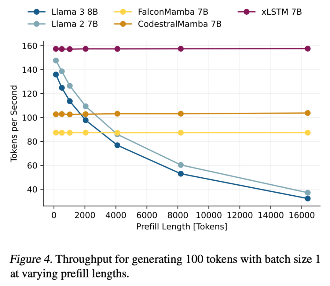 研究表明,xLSTM 7B 的文本生成速度比 Mamba 快约 50%,这主要得益于其优化的块设计。即使在预填充长度为 0 的情况下,xLSTM 7B 也比采用类似块设计的基于 Llama 的 Transformer 模型更快。