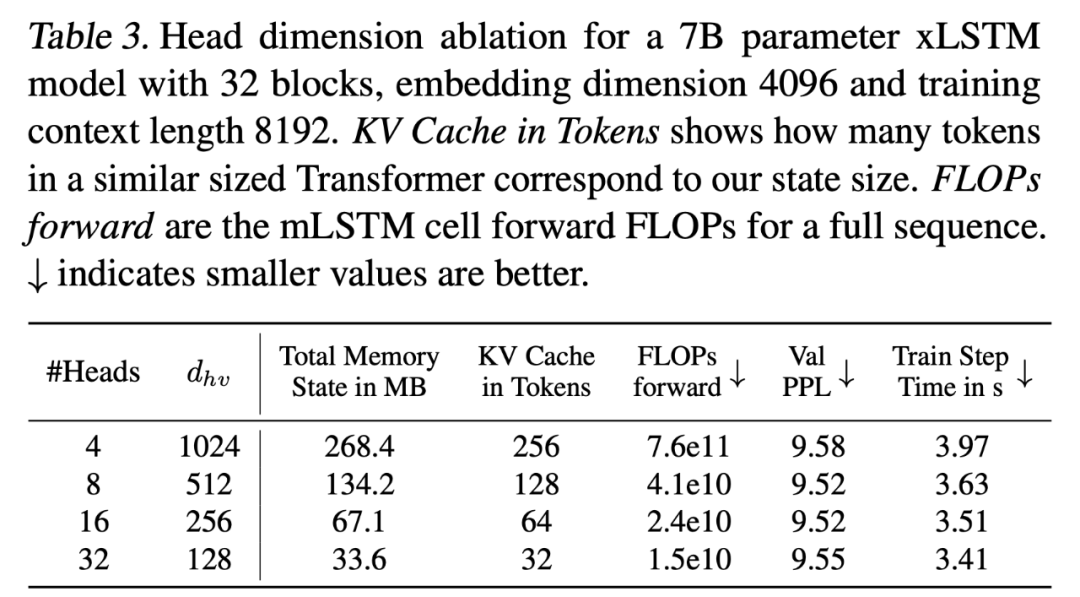 值得注意的是,长文本 xLSTM 7B 在 131K 上下文长度时实现了 20% 的平均准确率,尽管在降温阶段训练时仅使用了最多 32K 的上下文长度。这一点尤为显著,因为与具有不断增长的 KV 缓存(Key-Value cache)的 Transformer 不同,xLSTM 7B 必须在有限容量的固定大小内存中存储整个序列的信息(见表 3)。