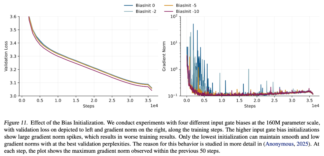 研究者发现,在训练初期,xLSTM 模型会出现较大的梯度范数峰值,这对模型的最终性能产生不利影响(详见下图 11)。将输入门初始化为较大的负值(如 - 10)能有效缓解这些梯度范数峰值,从而提升模型性能。