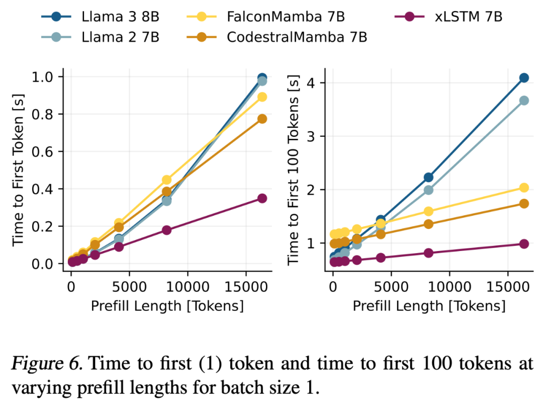在语言模型作为用户界面(可能在边缘设备上)的应用场景中,较短的响应时间至关重要。下图 6 展示了不同模型在处理各种长度的预填充(prefill)内容后,生成 1 个或 100 个 token 所需的响应时间或延迟。在所有预填充长度条件下,xLSTM 7B 模型均表现出最快的响应速度。