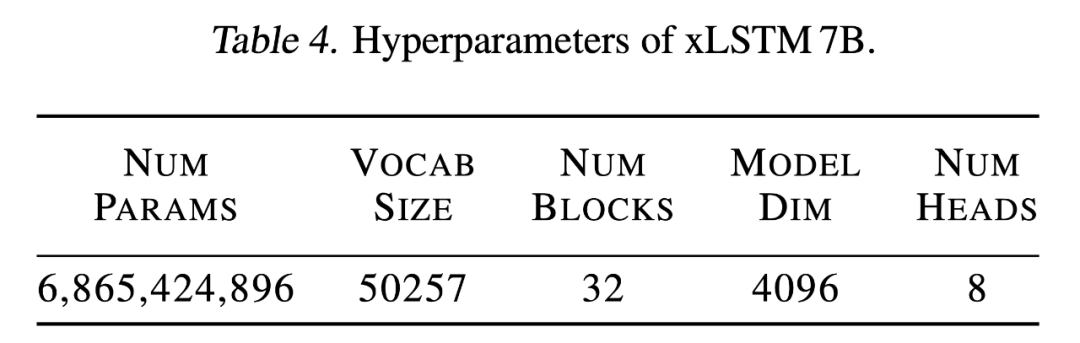 下表 4 为 xLSTM 7B 的超参数,包括模型参数(近 70 亿)、词表大小(50257)、块数量(32)、模型维数(4096)以及 head 数(8)。
