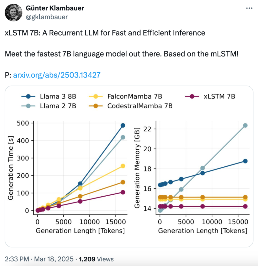 论文作者之一 Günter Klambauer 表示,xLSTM 7B 成为了最快、最高效的 7B 语言模型!