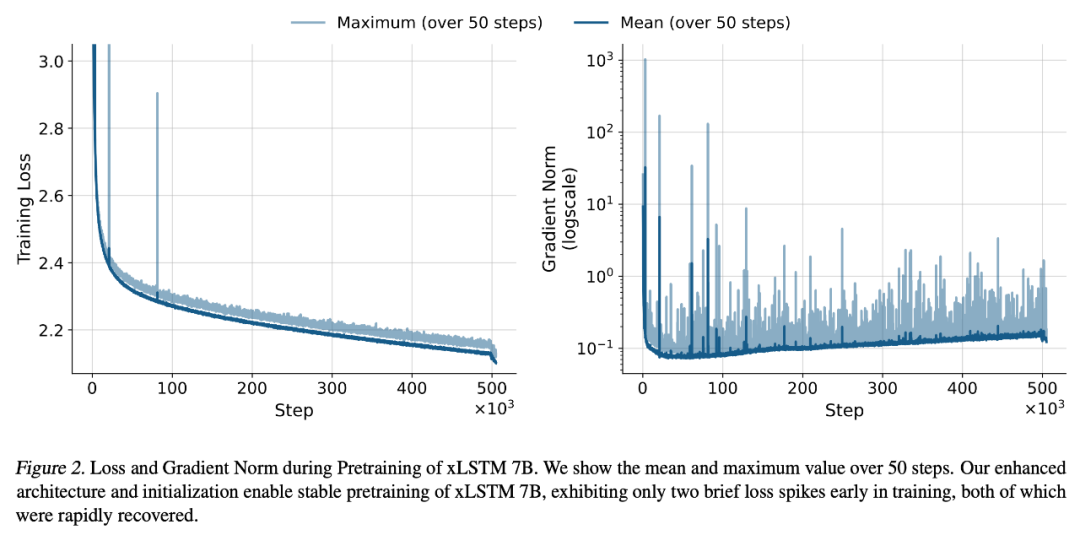 综上所述,这些优化措施使 xLSTM 7B 的预训练过程变得极为稳定,如下图 2 所示。