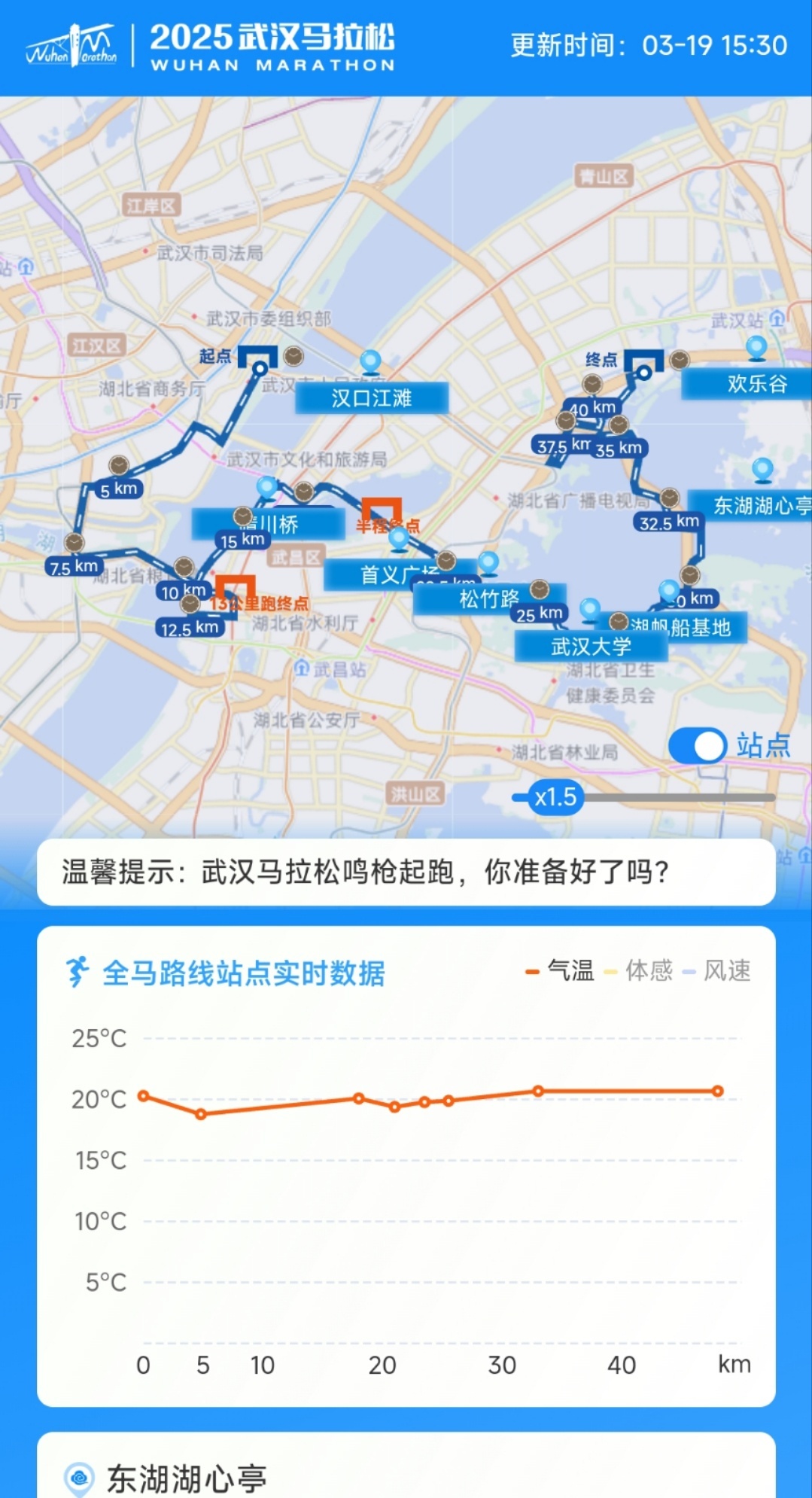 3月18日,九派新闻从武汉市气象局获悉,当日起,其官方微信公众号“武汉气象”推出2025年武汉马拉松气象地图,公布汉马全线8个站点的实时气温、湿度、风速、气压以及降水等气象信息,包括东湖湖心亭、欢乐谷、汉口江滩等点位,为市民参与、观看汉马提供气象支持。