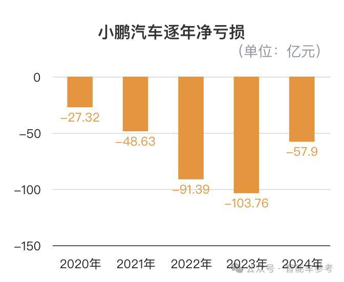 从财报数据看,2024年小鹏全年累计亏损57.9亿,较2023年的103.8亿元大幅收窄44%左右——这也是小鹏史上第一次年度净亏损下降。