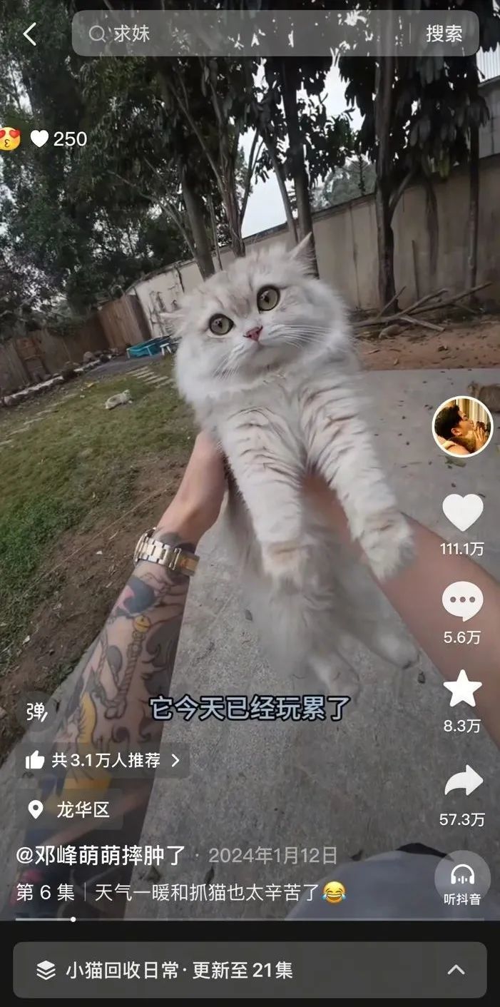 在短视频里,nana、小小、66等高颜值的猫咪和 “夹子音”“大花臂”的铲屎官邓峰吸引了大量粉丝,独特内容也让他在多个平台积累了超千万粉丝。