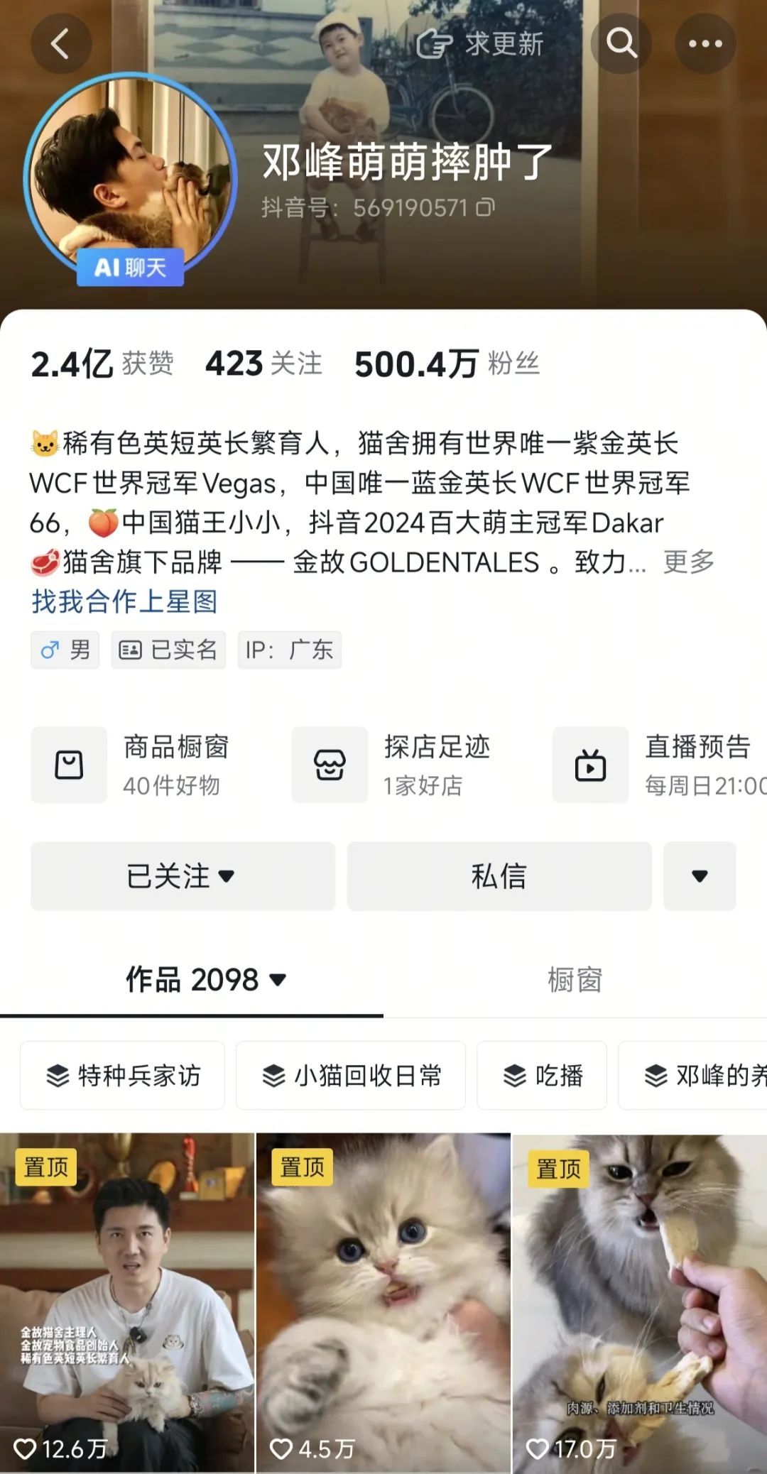 但就是这么苛刻的条件,依然让猫舍创作者@邓峰萌萌摔肿了 在抖音获粉500多万。他所售卖的布偶、金渐层等名贵品种猫,甚至需要买家排队等候。