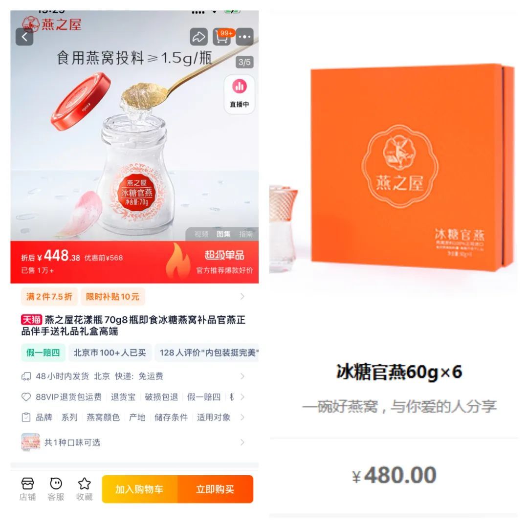 左图为燕之屋天猫旗舰店、右图为官网介绍的线下门店同款