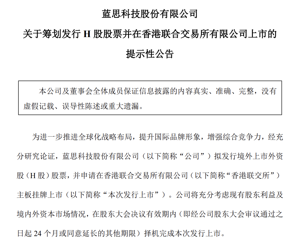 近期,蓝思科技发布公告称,拟发行境外上市外资股(H股)股票,并申请在香港联交所主板挂牌上市。