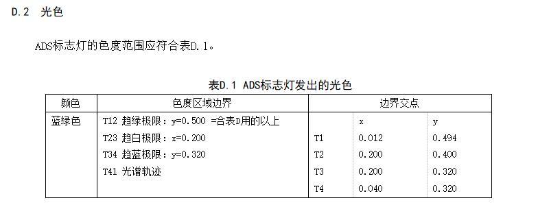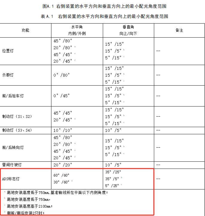 里面详细规定了 “ADS标志灯” 的位置、数量、颜色、发光强度、配光角度等具体细节。