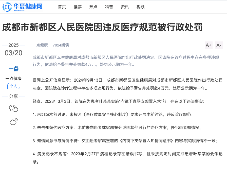 据网上公开信息显示:2024年9月13日,成都市新都区卫生健康局对成都市新都区人民医院作出行政处罚决定,因该院在诊疗过程中存在多项违规行为,依法给予警告并处罚款4万元,处罚公示期为一年。