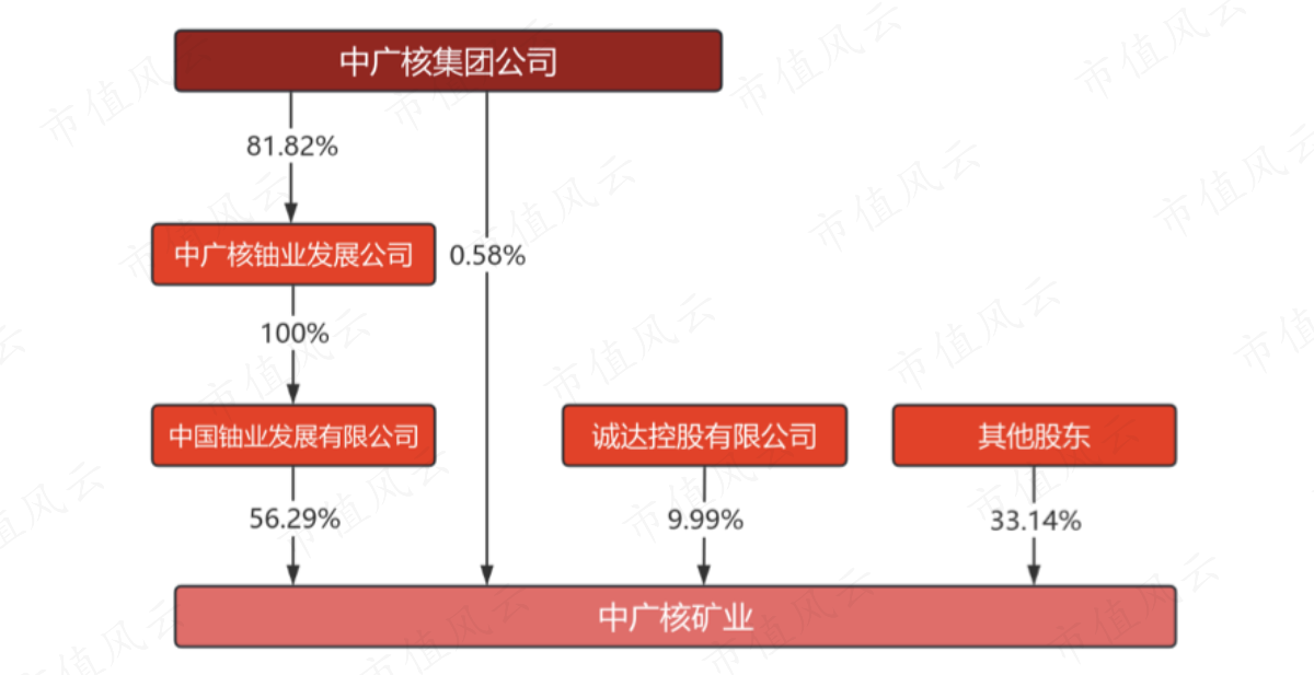 中广核矿业的控股股东是中国铀业发展有限公司,持股56.29%,实际控制人是中国广核集团有限公司,直接加间接持股56.87%。