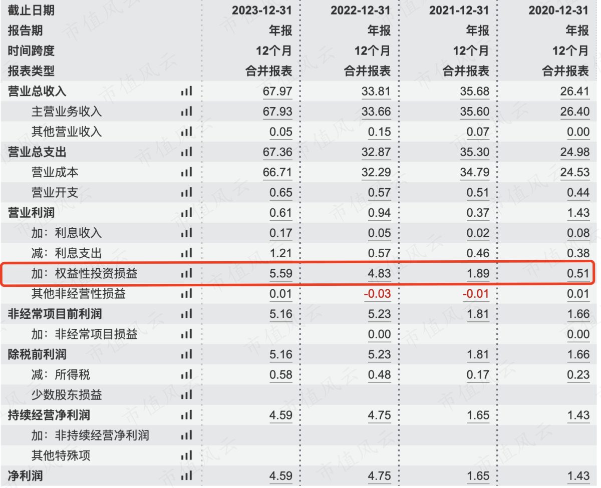 2021年-2023年公司净利润为1.65亿、4.75亿、4.59亿,其中投资收益分别为1.89亿、4.83亿、5.59亿。