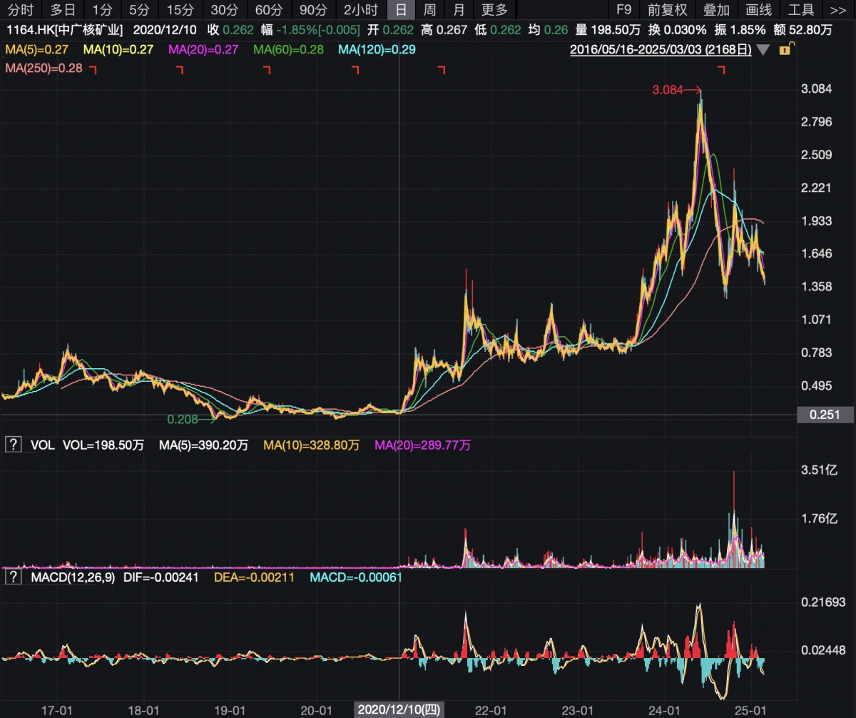 还有聪明的投资者把目光放在业绩更具弹性的上游资源铀矿。刚好港股有一家上市公司中广核矿业(1164.HK),既是香港主板上市产量最大的铀业集团,也是东亚唯一的纯铀业上市公司,股价最高涨了10多倍。
