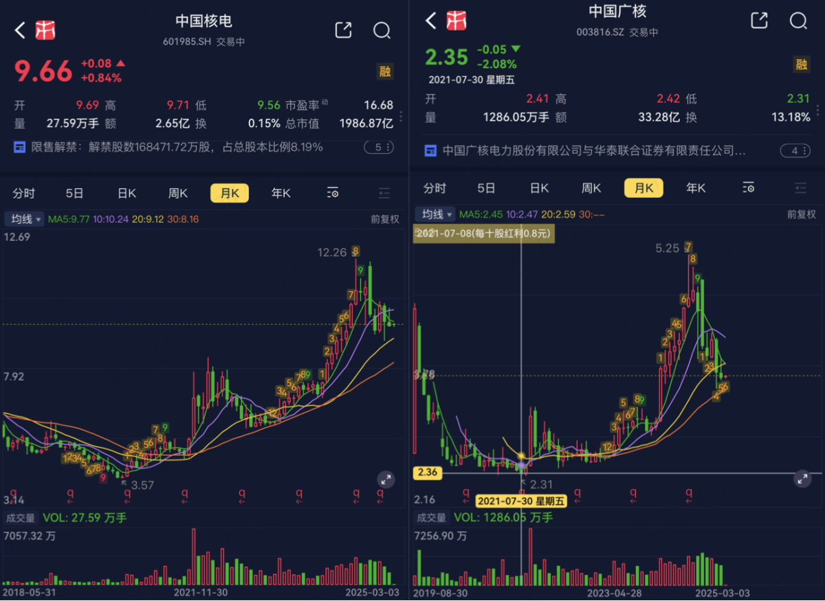 中国核电行业的两大巨头,中国核电从底部最高涨了3-4倍,中国广核最高涨了2-3倍。