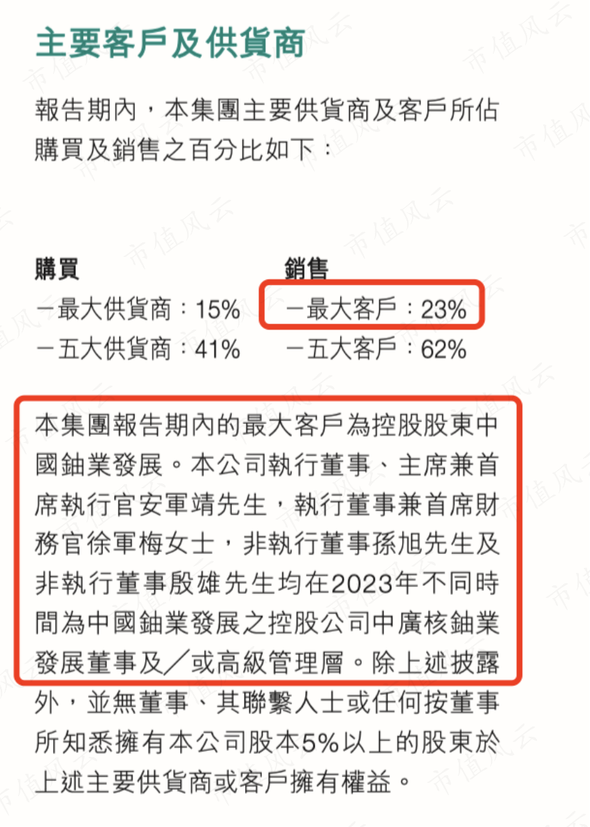 目前中广核矿业最大客户就是控股股东中国铀业发展有限公司,其实就是中广核集团,2023年占比23%,就是这一块业务出现亏损。