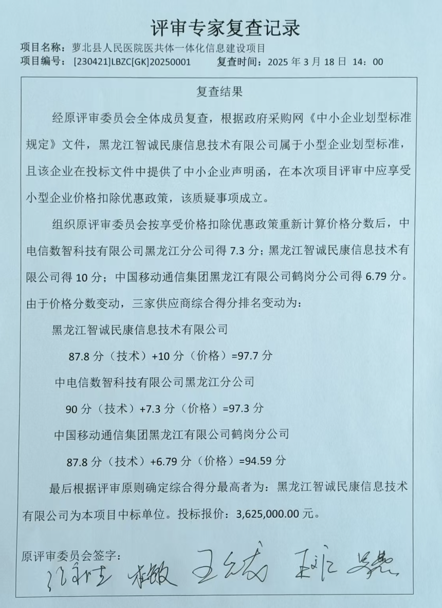 复查结果显示,黑龙江智诚民康信息技术有限公司得分为87.8分(技术)+10分(价格)=97.7分,反超中电信数智科技有限公司黑龙江分公司0.4分。原中电信数智科技有限公司黑龙江分公司中标资格无效,经采购人同意,由萝北县政府采购中心按流程发布变更通知。黑龙江智诚民康信息技术有限公司为本项目中标单位,投标价为362.5万元。
