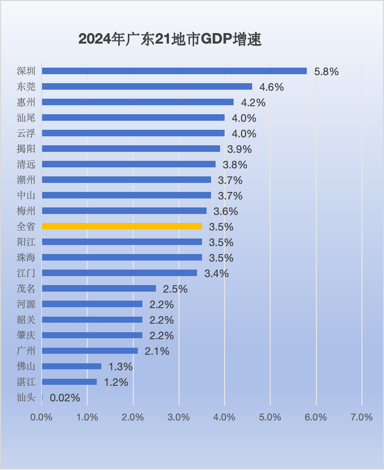 2024年,广东经济增速为3.5%,低于全国平均水平5.0%。其中,深圳以5.8%的增速挑起大梁,经济增量达1898亿元,占全省增量的“半壁江山”。
