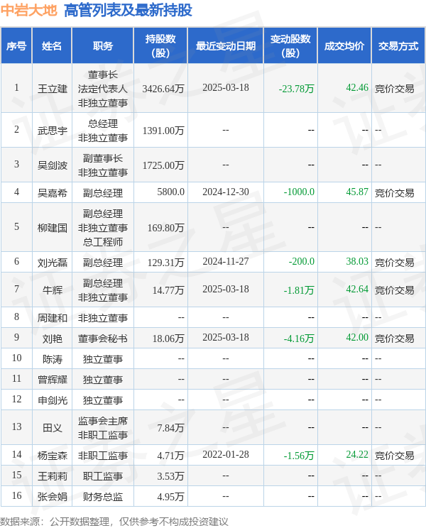 证券之星消息,根据3月20日市场公开信息、上市公司公告及交易所披露数据整理,中岩大地(003001)最新董监高及相关人员股份变动情况:2025年3月19日公司董事王立建、董事,高管牛辉共减持公司股份1.18万股,占公司总股本为0.0093%。变动期间公司股价下跌1.61%,3月19日当日收盘报41.57元。