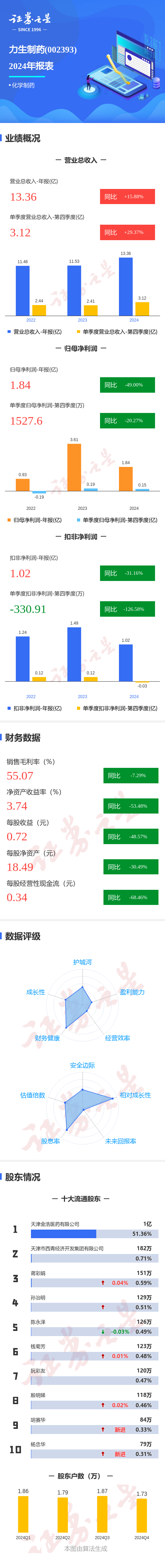 证券之星消息,力生制药2024年年报显示,公司主营收入13.36亿元,同比上升15.88%;归母净利润1.85亿元,同比下降49.0%;扣非净利润1.03亿元,同比下降31.16%;其中2024年第四季度,公司单季度主营收入3.12亿元,同比上升29.37%;单季度归母净利润1527.6万元,同比下降20.28%;单季度扣非净利润-330.92万元,同比下降126.59%;负债率17.03%,投资收益1.0亿元,财务费用-4359.46万元,毛利率55.07%。