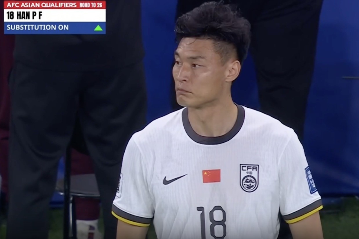 这是即将年满32岁的韩鹏飞在国足的正式比赛首秀,此前他多次入选国足但没有出场过。