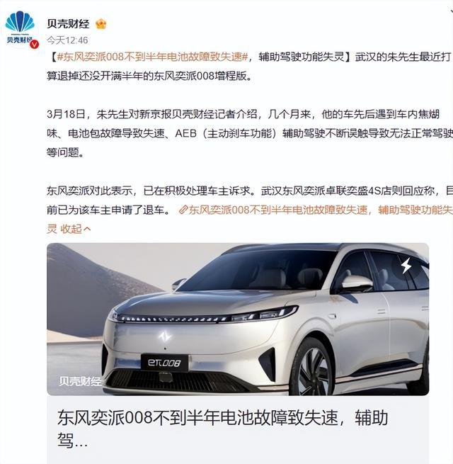 据新京报贝壳财经3月20日报道,武汉朱先生自去年10月入手东风奕派eπ008后就成了烦心事,几个月来,他的车先后遇到车内焦煳味、电池包故障导致失速、AEB(主动刹车功能)辅助驾驶误触导致无法正常驾驶等问题。而东风奕派则表示已在积极处理车主诉求,其购车的武汉东风奕派卓联奕盛4S店则回应称,目前已为该车主申请了退车。