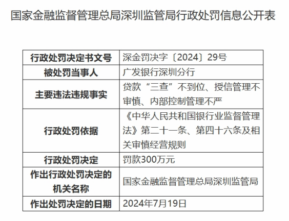 2024年7月,广发银行深圳分行因贷款“三查”不到位、授信管理不审慎等问题被罚款300万元。