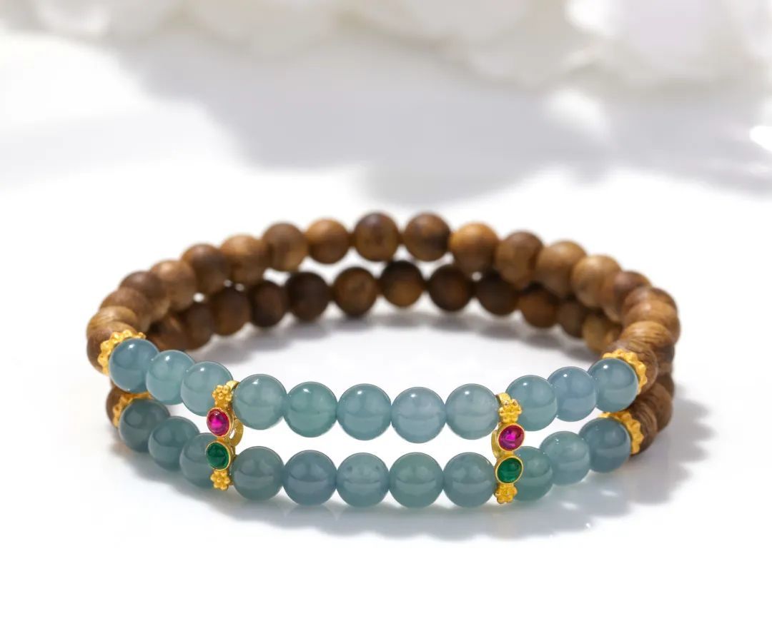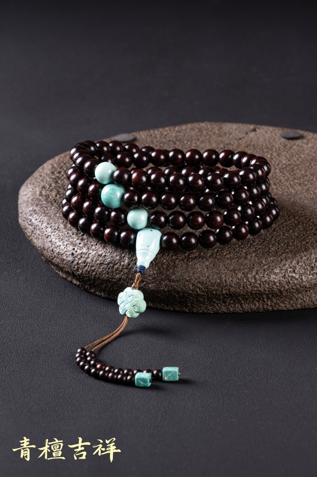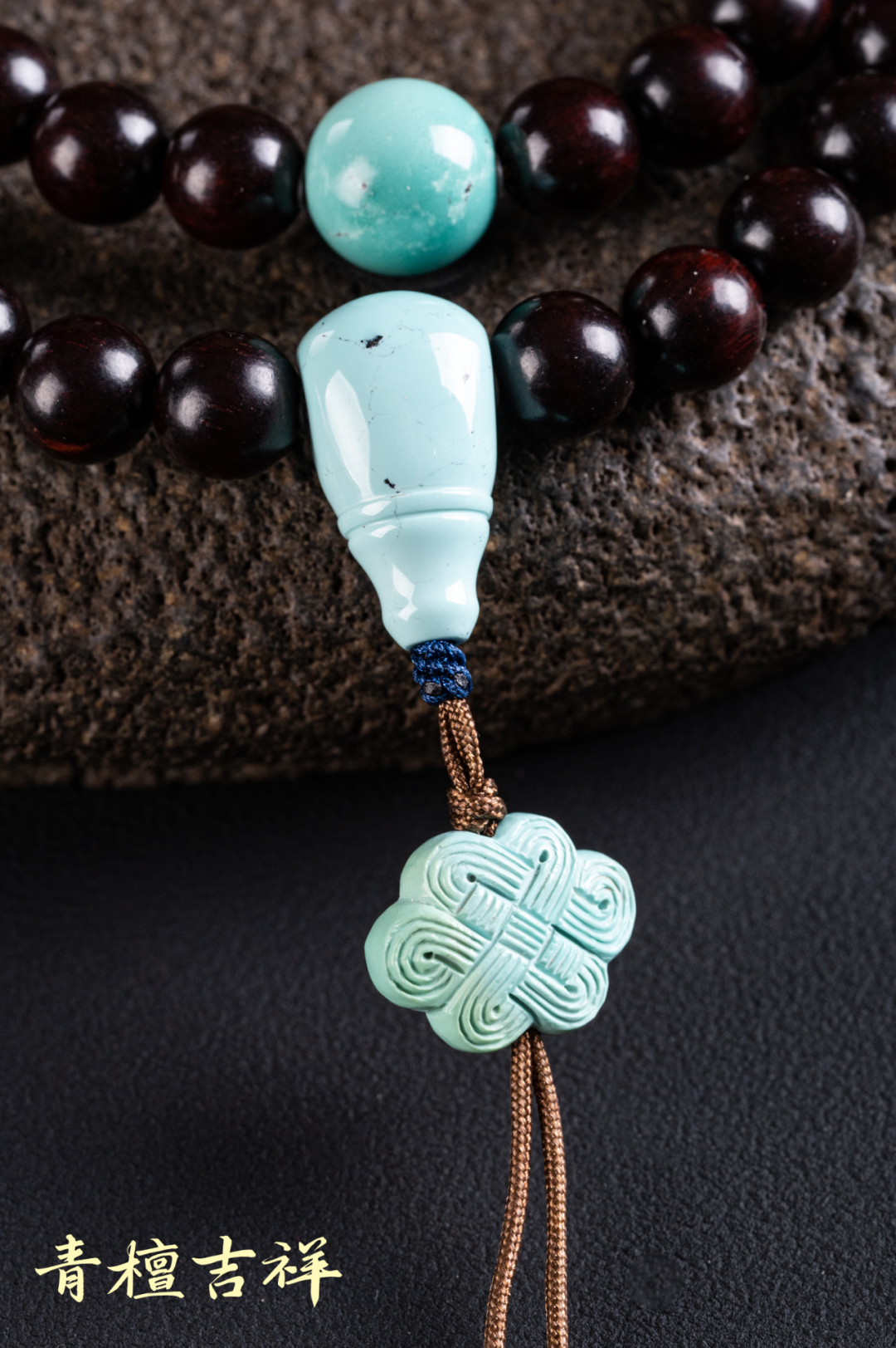 珠子间以匠心独运的绳结串联,绿松石巧妙点缀其间。紫檀纳福,松石佑安,赋予传统手串轻奢美学价值。