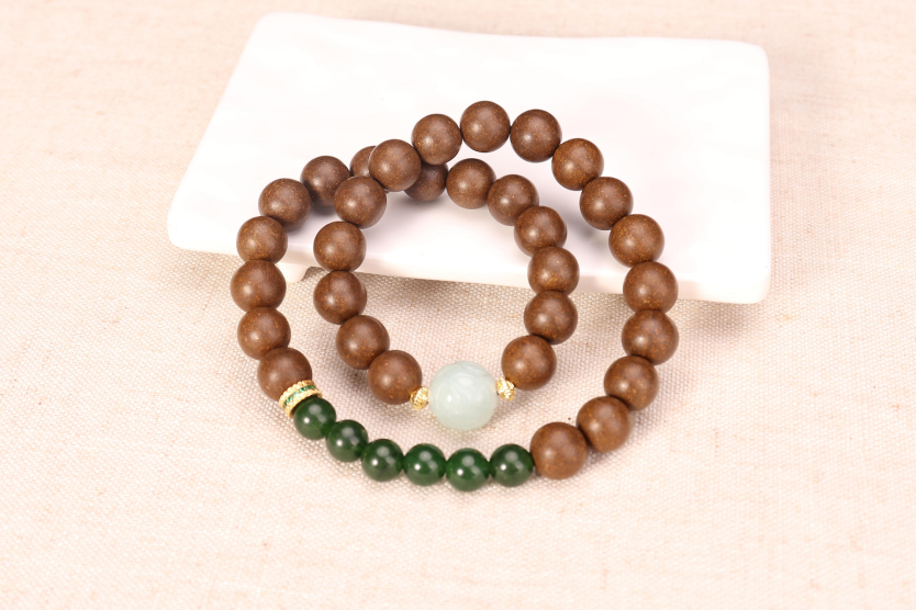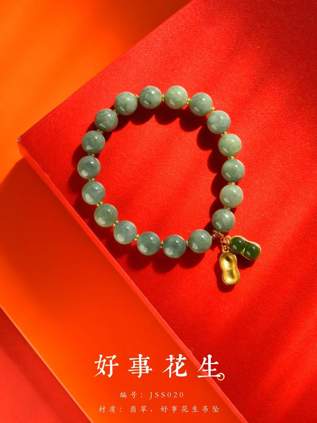 以花生作为主要配饰,搭配翡翠作为手串主体,花生谐音 “好事发生”,翡翠象征吉祥如意,二者相得益彰,凝萃出 “好事花生,心想事成,好事成双” 的美好寓意。