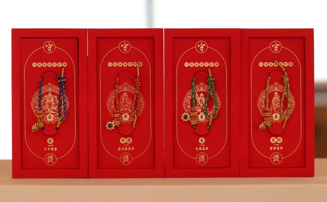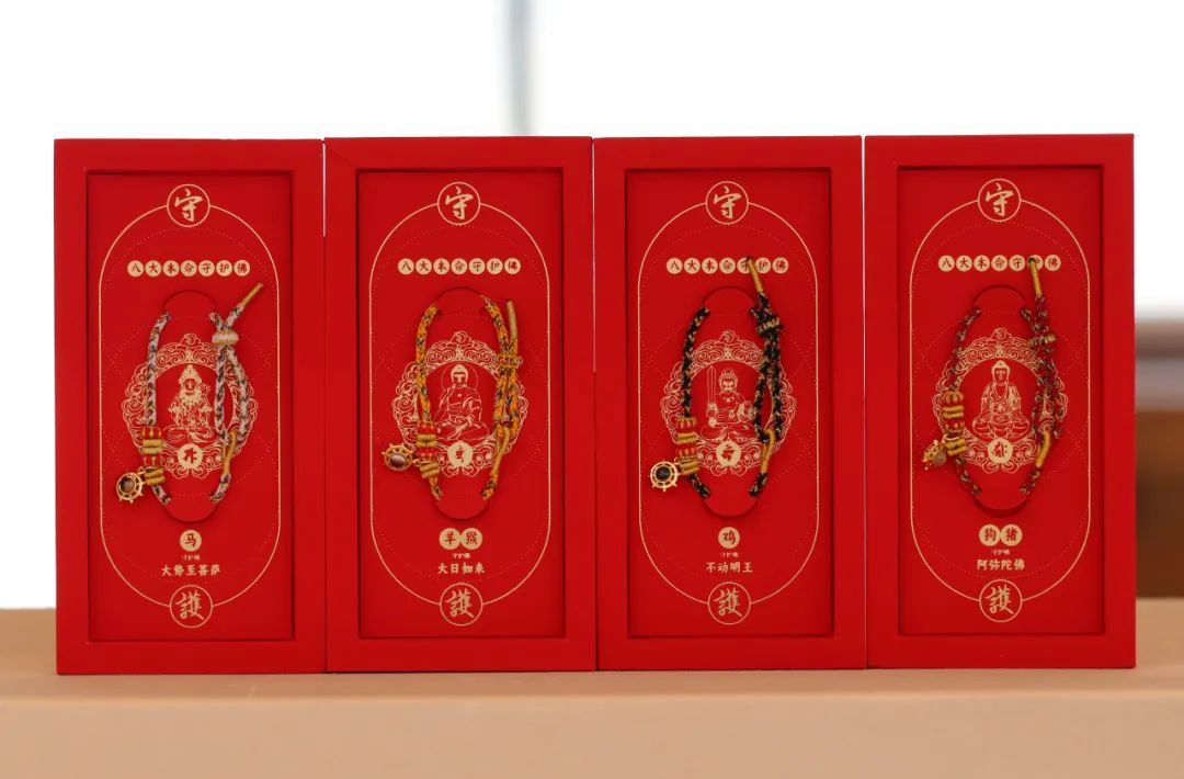 采用非遗传承的古法手工编绳技艺,如八股编工艺、璎珞结和圆满结等,这些传统编绳技艺历史悠久,每一个绳结都凝聚着工匠的心血和智慧。巧妙地将经文和生肖守护佛像以微雕科技雕刻在投影石上,为佩戴者增添了一份守护力量。