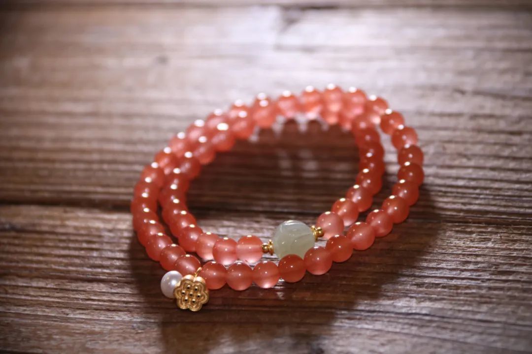 樱桃红南红其独特的红润色彩在一直象征着吉祥、喜庆与繁荣,代表着生活红红火火。南红作为天然宝玉石,历经岁月沉淀,每一颗珠子都蕴含着大地的能量,能为佩戴者带来活力与热情。