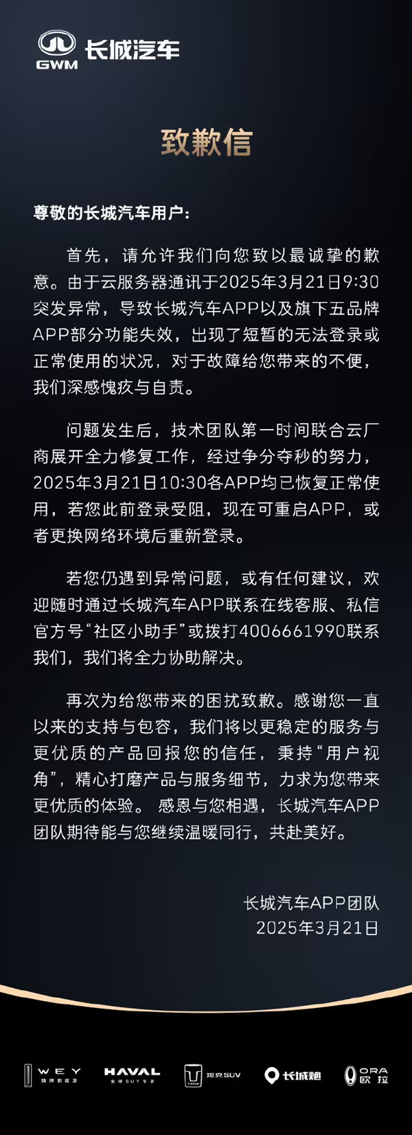 长城汽车官方发布了一则致歉信:“由于云服务器通讯于2025年3月21日9:30突发异常,导致长城汽车App以及旗下五品牌App部分功能失效,出现了短暂的无法登录或正常使用的状况,对于故障给您带来的不便我们深感愧疚与自责。”