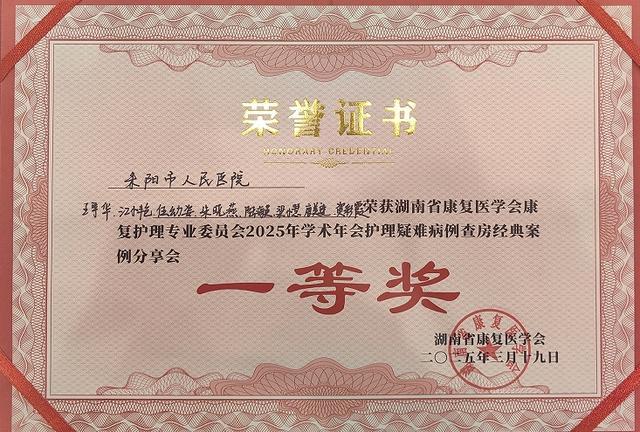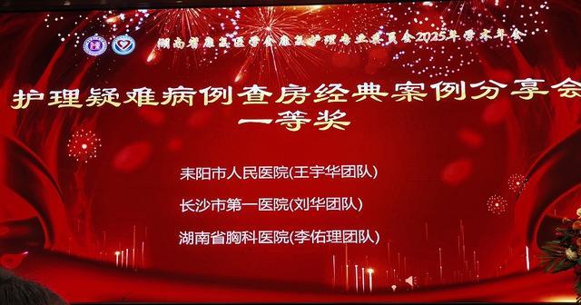 2025年3月19日,在湖南省康复医学会护理专业委员会学术年会护理疑难病例查房竞赛中,耒阳市人民医院护理团队凭借扎实的专业功底、规范的查房流程和卓越的团队协作,从全省19支参赛队伍中脱颖而出,斩获竞赛一等奖(第一名)!这一荣誉充分展现了医院护理团队在疑难病例护理领域的专业实力和追求卓越的精神风貌。