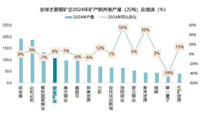 需要指出的是,据2024年公开数据,紫金矿业以当年约107万吨的矿产铜产量,位列全球前四,近五年保持24%复合增长率,为全球主要铜企中矿产铜增长最多的公司之一。
