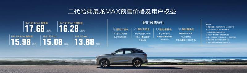 2025年3月21日,哈弗品牌正式宣布二代哈弗枭龙MAX预售,预售区间为13.88-17.68万元,同时还有四重限时预售好礼。包括限时订金礼:下订享2000元抵5000元购车款;限时升级礼:下订享价值4000元19英寸“繁花旋影”五辐轮毂;限时保养礼:下订享5年5次免费基础保养权益(含首保/工时);限时置换礼:置换客户享本品置换7000元补贴,非本品置换6000元补贴。