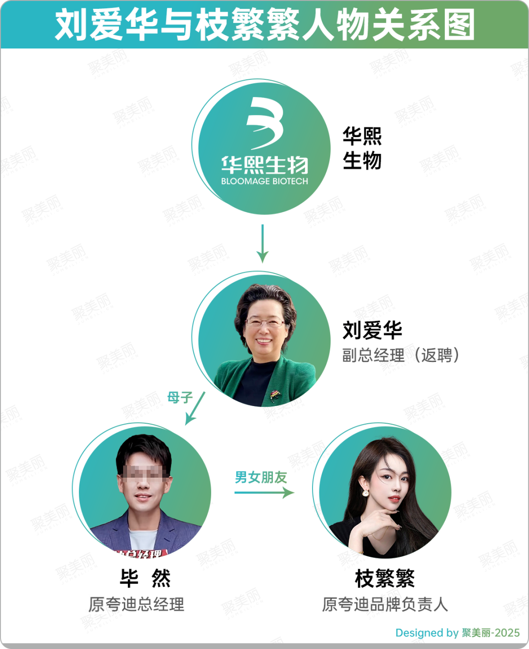 该知情人告诉聚美丽,刘爱华的儿子是原夸迪总经理毕然,而枝繁繁则是毕然的女朋友。具体关系如下图所示。