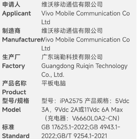 据网传信息,维沃移动通信有限公司旗下型号为“iPA2575”的平板电脑已获认证,生产厂商为广东瑞勤科技有限公司。该平板匹配型号为V6660L0A2 - CN的充电器,支持最高66W有线充电。有推测称,“iPA2575”大概率是iQOO Pad 3 Pro,其将搭载联发科天玑9400+处理器,配备一块12.5英寸的大尺寸LCD屏幕。