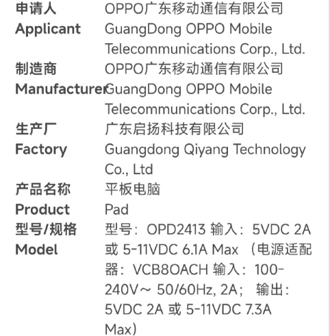无独有偶,近日,OPPO广东移动通信有限公司旗下型号为“OPD2413”的平板电脑也通过了国家认证,生产厂商为广东启扬科技有限公司。此平板匹配型号为VCB8OACH的充电器,支持最高80W有线充电。据推测,“OPD2413”大概率是一加Pad 2 Pro,它将搭载高通骁龙8至尊版移动平台,配备一块13.2英寸的大尺寸LCD屏幕。
