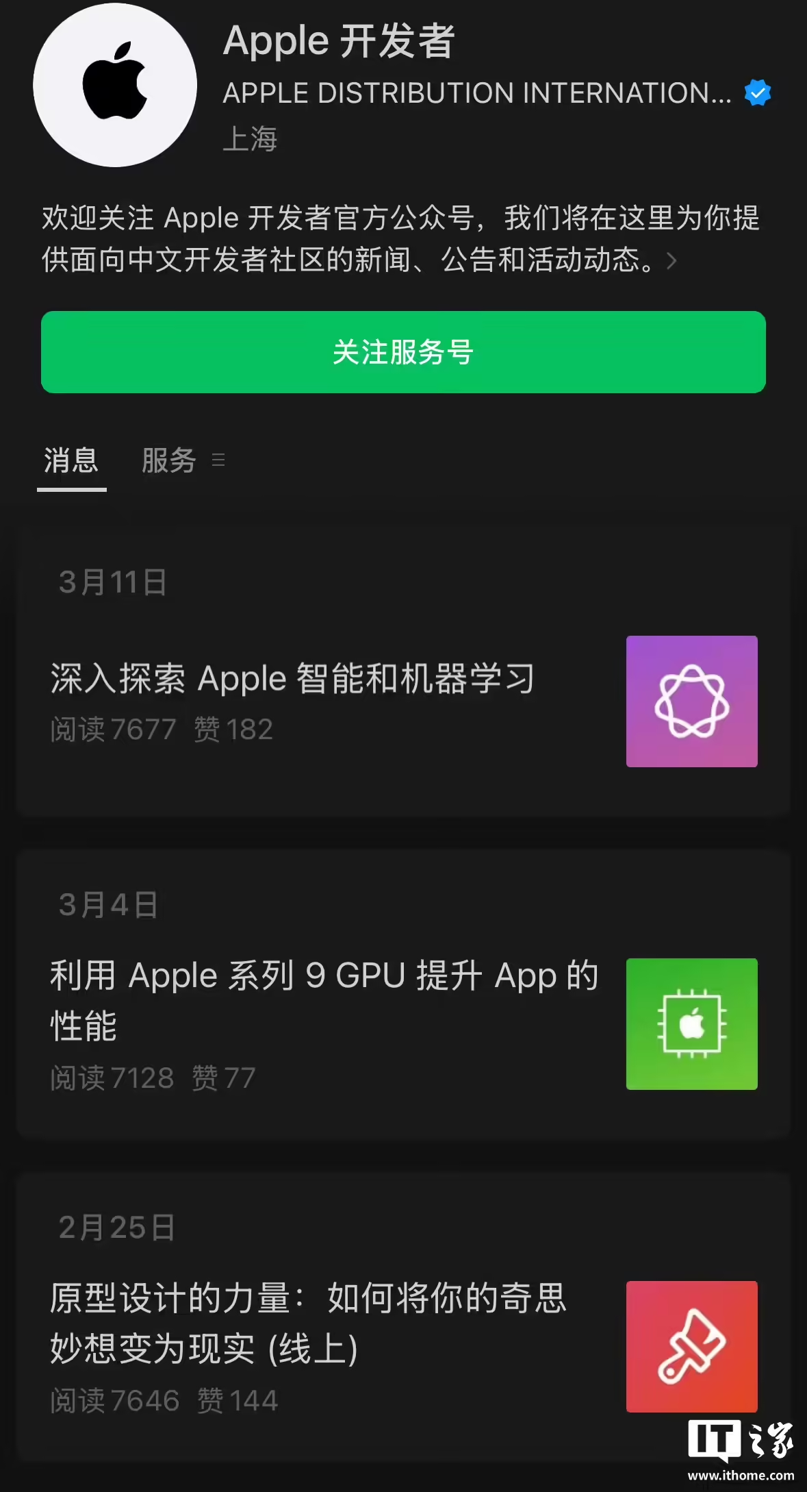 目前该公众号一共发布了 3 则文章,分别为「原型设计的力量:如何将你的奇思妙想变为现实(线上)」、「利用 Apple 系列 9 GPU 提升 App 性能」、「深入探索 Apple 智能和机器学习」,均为苹果开发者线上讲座直播预告。