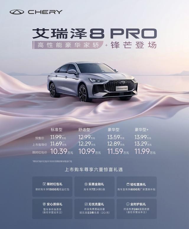 艾瑞泽8 PRO的定价堪称“降维打击”。在10万-12万元区间,用户往往只能选择合资品牌的入门级车型或自主品牌的低配版本,但艾瑞泽8 PRO却以“限时红包价”将性价比拉满——10.39万起,叠加13000元现金红包、7万24期0息贷款、8000元置换补贴等六大权益,实际购车成本甚至下探至9万元区间。这一招不仅让消费者直呼“真香”,也让同级对手压力陡增。