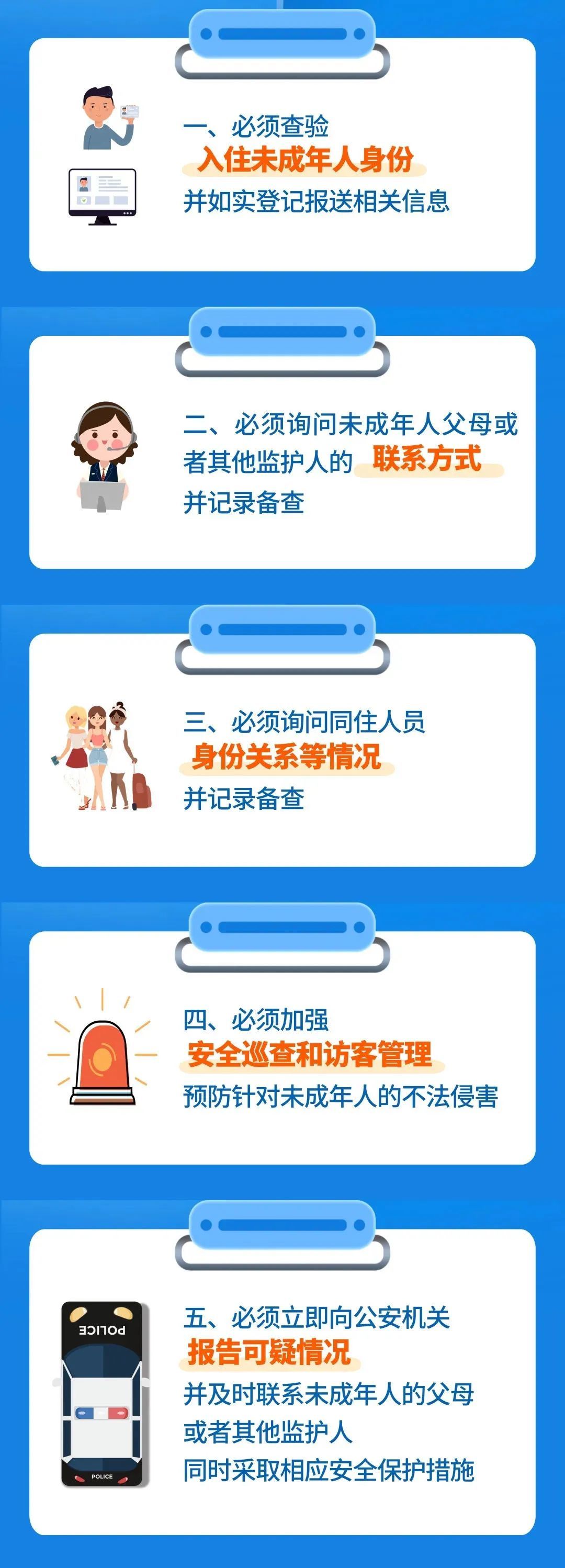 所有旅馆经营者应认真履行保护未成年人的法律义务和主体责任,严格按照旅馆经营者接待未成年人入住“五必须”要求落实,确保旅馆业经营者和工作人员熟知工作要求,熟练操作流程。如违反有关法定义务将被依法追究相应法律责任。