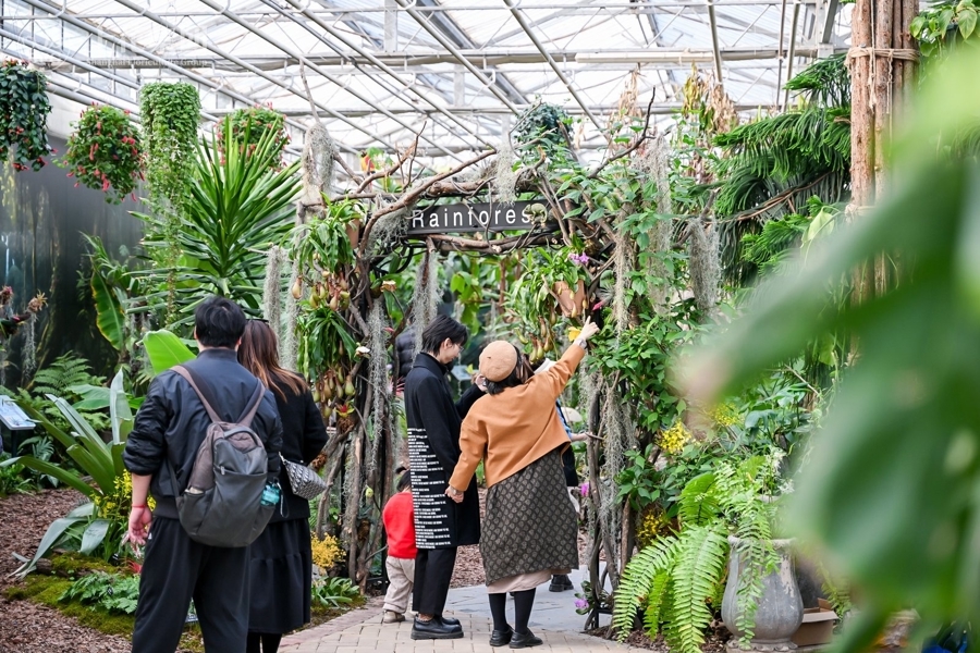 坐拥4000平方米生态温室的热植园则汇聚了全球七大特色植物群落,展示300多种热带植物,为游客打造从湿润的热带雨林、干旱的沙漠绿洲、神秘的水生秘境到浪漫的地中海花园等多个截然不同的热带植物生境景观。不仅有叶片如油画般斑斓的彩叶芋、自带几何美感的龟背竹“白锦”、丝绒质感的椒草锦秋海棠、身形飘逸的密叶猴耳环,还有鹿角蕨、猪笼草、捕蝇草、王莲、香蕉树、木瓜树等珍奇有趣的植物景观。