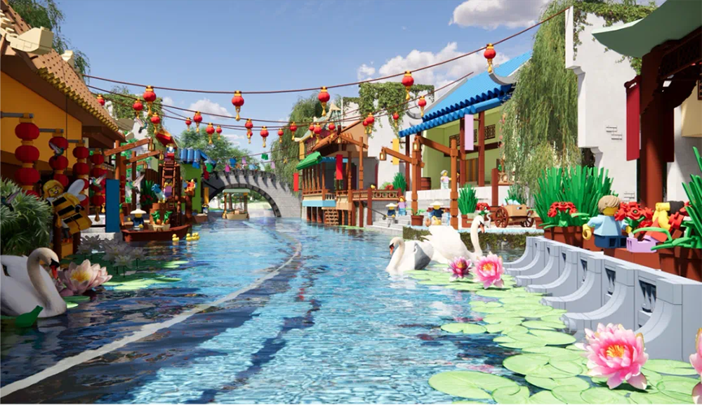 以乐高积木复刻江南水乡场景,游客可乘船穿梭于亭台楼阁与桥梁之间,结合声光电效果展现水乡风情。