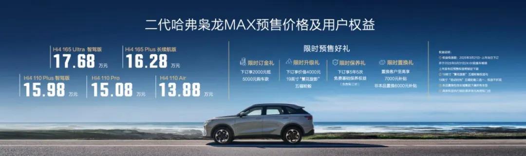 3月21日,长城汽车发布第二代Hi4智能四驱电混技术,董事长魏建军亲自上台开讲,首搭车型中型插混SUV二代哈弗枭龙MAX以13.88万元起售价开启预售,共五款车型,全系标配电四驱,将混动四驱车型入门门槛大幅拉低。