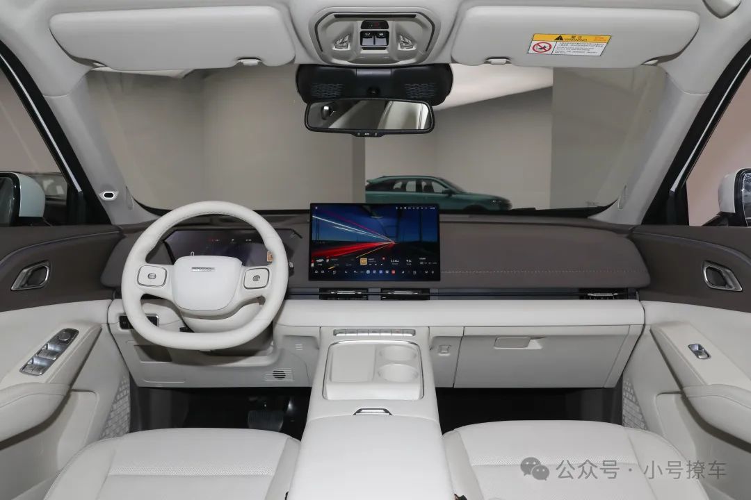 内饰方面,整体设计风格比较简洁,提供有双幅式多功能方向盘、悬浮式全液晶仪表盘、悬浮式中控屏以及电子怀挡,中控台的层次感比较强,手机无线充电面板也没有缺席。中控运行了Coffee OS 3系统,搭配的骁龙8155车规级芯片以及16GB内存。