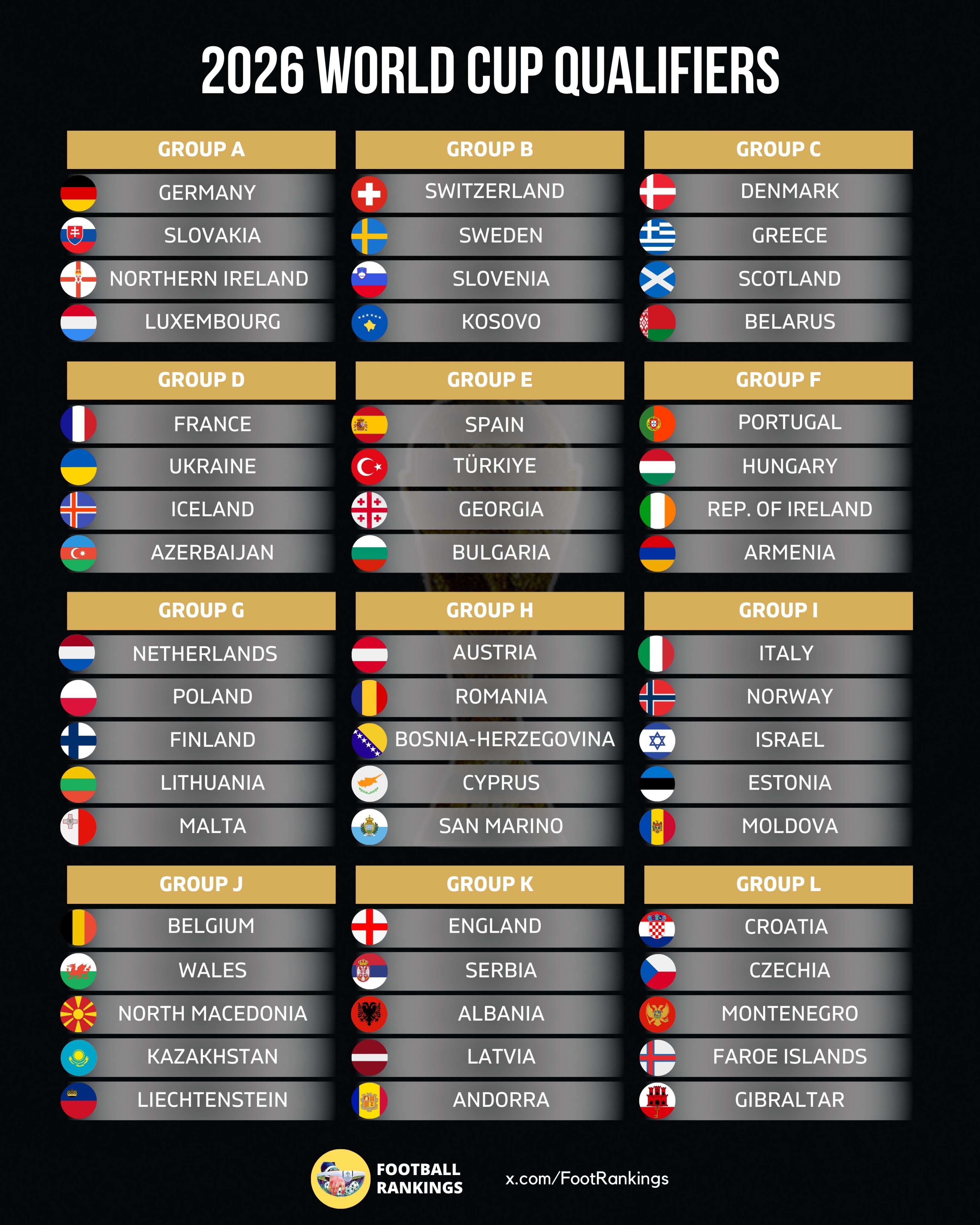 欧洲区预选赛12个小组里,每组第一名直通世界杯正赛。12个小组第二名将进入到附加赛,还有4个附加赛席位由欧国联产生,共16支球队进入到欧洲区附加赛。